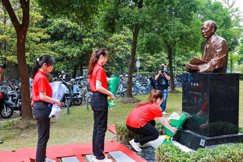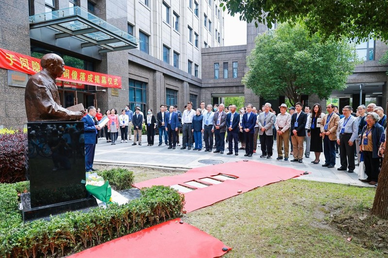 当天上午,在复旦大学校友会Bet365中文网址 分会成立之际,于同隐先生铜像在复旦大学江湾校区高分子楼前草坪正式落成揭幕。