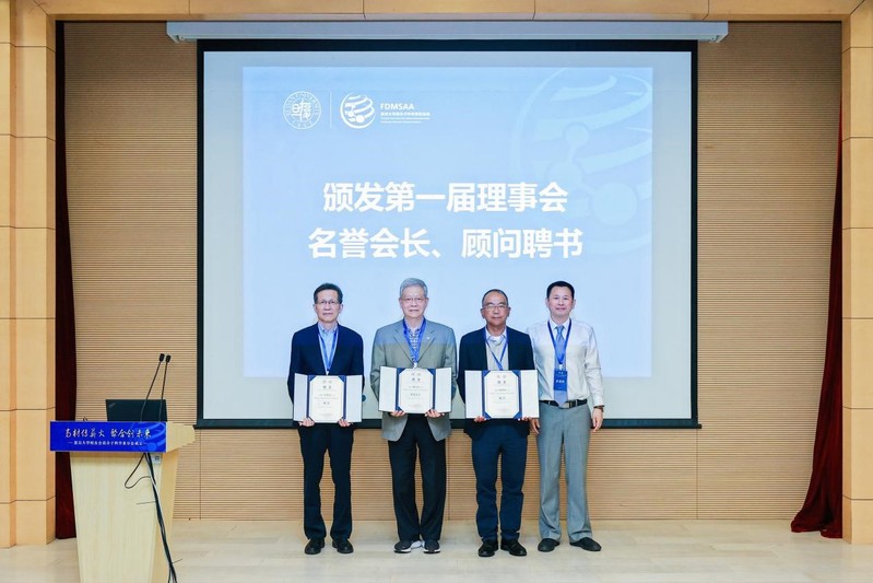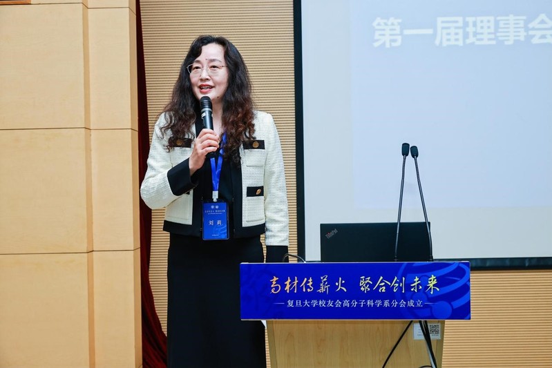 复旦大学外联处处长刘莉宣读新当选的复旦高分子校友会第一届理事会理事、名誉会长及顾问名单,并为第一届理事颁发聘书。