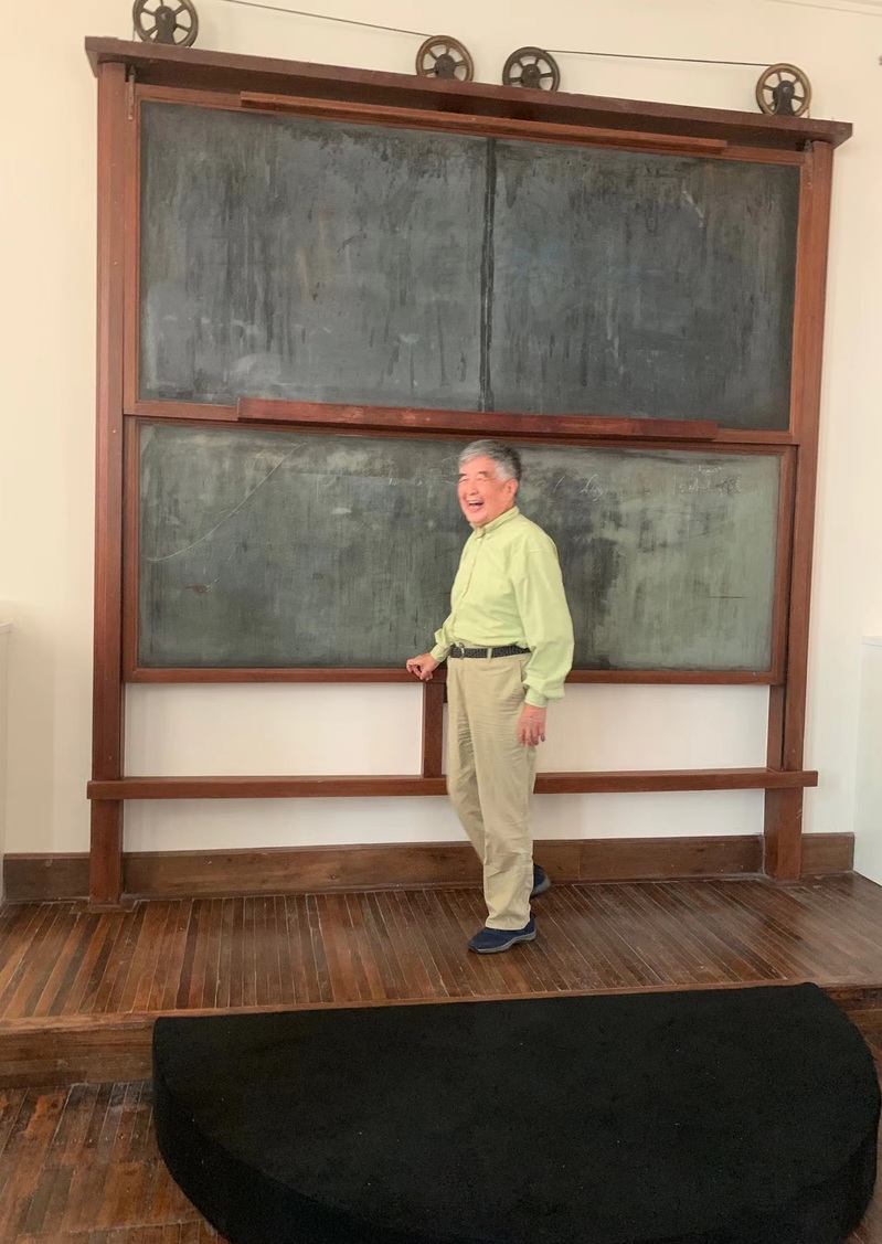 访谈结束,我们一起参观了修缮后的雷士德工学院。我很荣幸地享用了当年校长专用的仅容一人的“迷你”电梯。走进保留完好修旧如旧的教室,见到带有轴轮的提拉式的黑板,立即忆起1955年我刚进复旦大学求学时第一次见到这种黑板时的新奇,亲切之感油然而生,禁不住兴奋起来。