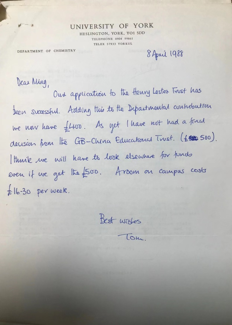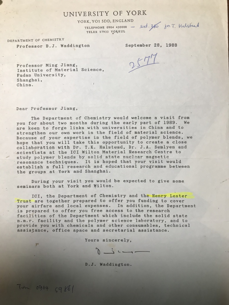 事情要从1987年说起,那年春天,我受德国马普高分子研究所所长Wegner教授之邀去该所访问,为期两个月。我同其它国家的访问学者、博士后和教授同住在一个“大院”里。这时我认识了英国York大学的Tom Halstead 博士,他是马普高分子研究所的Spiess教授的客人。Tom是非常温和、健谈的学者,容易相处,我们一见如故。Tom不是高分子学家,专长是在固体核磁共振的材料应用方面,他们学校也有很好的相关仪器。我们深入交谈后“蹦出火花”,发现可以进行合作,即一起用固体核磁共振仪器来研究高分子工程塑料的共混物的相容性问题。他热情很高,说回英国后为我访英申请经费。其实我对此不抱太大希望,因为那时英国撒切尔政府正在搞‘cut spending’,大学都很穷。Tom回英国后真的向好几个有可能对中国学者提供资助的基金组织提出申请,但都没有成功。直到1988年4月,我突然收到Tom来信,他说很开心,他为我向Henry Lester Trust的申请成功了!