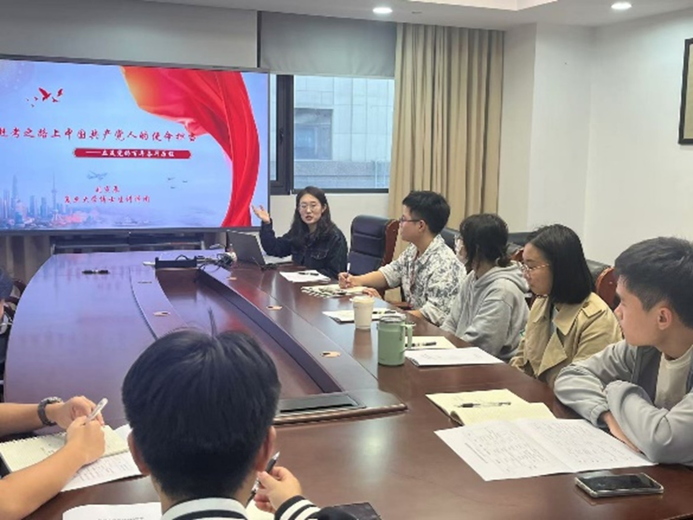 开班仪式结束后,培训班进行首场理论学习。为了让大家更好地了解中国共产党百年拼搏历史和中国共产党人百年不渝的责任与担当,本次培训班邀请复旦大学博士生讲师团刘宣辰同学为大家授课,专题学习的主题为《“赶考”之路上中国共产党人的使命担当》。她详细阐述了中国共产党从成立之初的艰难困苦,到如今的繁荣富强,所经历的百年拼搏历程。她通过丰富的历史资料和生动的案例,展现了中国共产党人在不同历史时期所展现出的使命担当和奋斗精神。刘宣辰同学强调,中国共产党人始终坚持以人民为中心的发展思想,把为人民谋幸福、为民族谋复兴作为自己的初心和使命。在“赶考”之路上,中国共产党人不断自我革命、自我完善,以实际行动践行着自己的承诺和担当。”