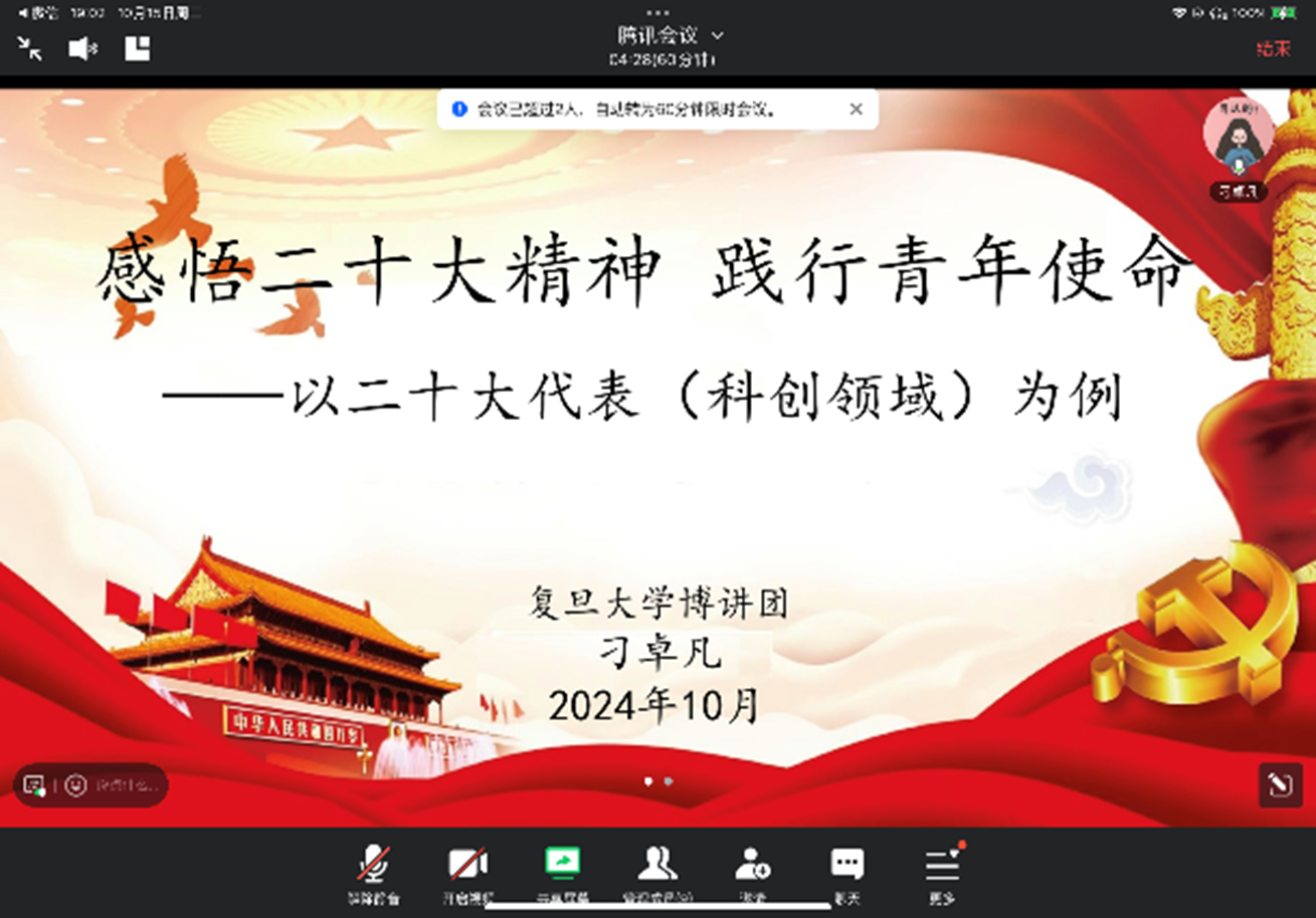 2024年10月15日晚,培训班迎来第二场理论学习,主题为《感悟二十大精神 践行青年使命:以二十大代表(科创领域)为例》。复旦大学博士生讲师团刁卓凡同学受邀授课,她通过分享二十大代表在科创领域的先进事迹,激发了学员们的深刻思考与情感共鸣。学员们深受启发,纷纷表态将以实际行动响应党的二十大精神,勇担青年使命,为科技创新和社会发展贡献力量。