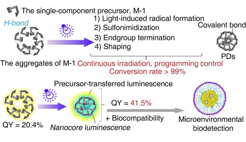聚合物点(Polymer dots, PDs)因具有可设计的纳米结构、较好的生物相容性、易调控的光致发光特性和可回收等优点一直备受相关领域研究者们的关注。然而,作为一种新型纳米材料,当前仍然缺乏原位、实时和非接触式的合成方法。