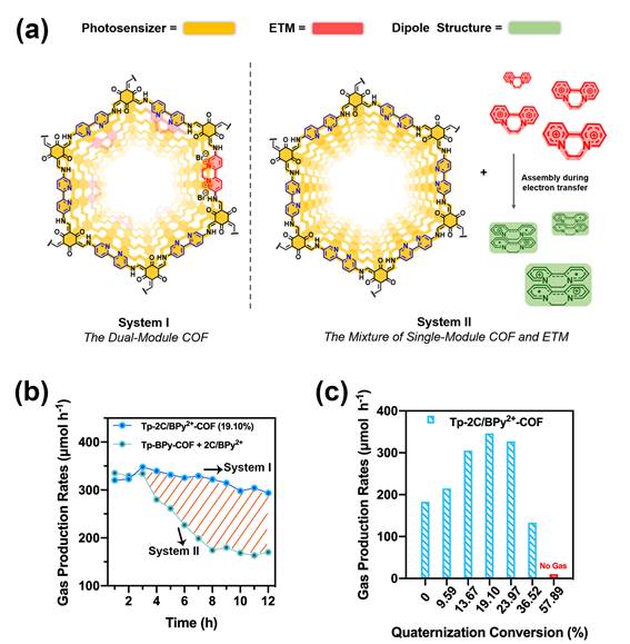 研究团队制备了具有光敏和电子转移双模化的联吡啶类COF材料,实现了长效而优异的光催化产氢性能。将一系列具有不同电子转移能力的环化联吡啶季铵盐分子作为ETM,通过后修饰的方法引入到含有联吡啶基元的COF骨架上,通过反应控制使得单个ETM自隔离式的固定在框架上,有效抑制了它们相互形成双极子结构,保证了长效的电子转移能力。相比与未修饰COF和ETM小分子简单混合体系(II),双模化COF(体系I)的产氢速率在长循环中更稳定,而游离态小分子ETM则会在光催化反应中,形成稳定的双极子结构而失去电子转移功效。