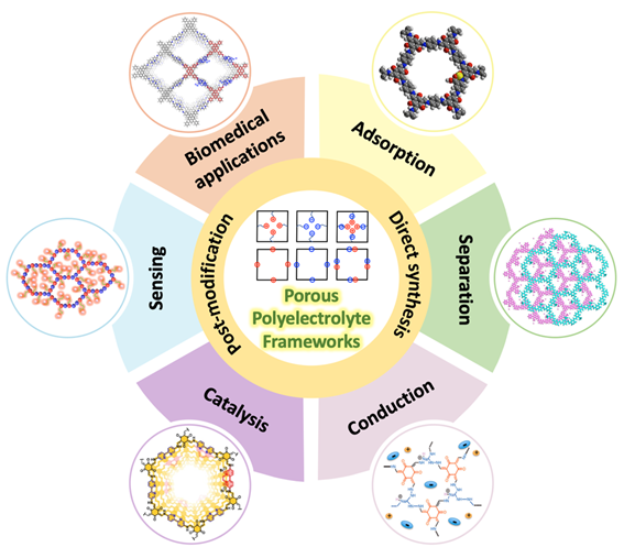 多孔聚电解质框架是在有机多孔材料的框架或侧基上引入离子功能基元,实现特定的电荷诱导效应,体现出了以下优点:(1)静电相互作用与尺寸筛分效应结合增强了孔道对客体分子的亲合性和选择性,提高了传质过程;(2)带有电荷的功能单元固定在框架的侧基使得孔道被离子化,增大了反应界面,提升了催化和传感的性能;(3)共轭框架上的离子位点提高了电子/空穴的分离和自由电荷的迁移,有利于光/电化学应用。由此在吸附分离、离子传导、催化、传感和生物应用等领域展现出了优异性能和应用前景。研究团队将此类材料分为晶型和无定形两类,分别综述了其合成的构筑基元、反应类型、合成策略,以及在多个领域的应用潜力,并且展望了多孔聚电解质材料的主要挑战和发展前景。