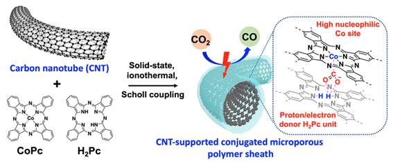 该工作发展了一种通过双管齐下助力电催化过程的策略,将酞菁单元作为电子/质子双给体来调控CNT表面单原子金属的催化性质,实现了稳定而高效的电催化CO2还原反应,此外无需功能修饰的酞菁原料来源广泛,为开发廉价高效的聚合物电催化剂提供了新思路。