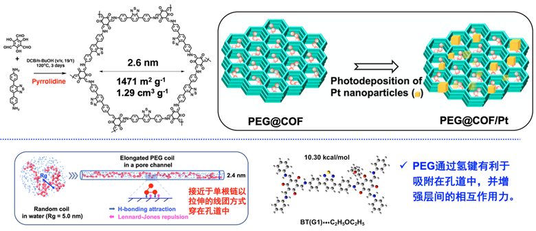 由此,研究团队提出采用线性聚合物PEG填充二维COF孔道来稳定并增强COF层间堆叠的相互作用,从而提高光催化过程中的光生载流子迁移,促进COF光催化分解水产氢的性能。该工作合成了含有苯并噻二唑单元的酮-烯胺式二维COF(BT-COF),显示了高度有序的AA堆叠排列,BET比表面积达到了1471 m2 g−1,可在长程的一维孔道中填充线性PEG聚合物。采用粗粒化模型,明确了PEG线团以拉长的构象受限于2.4nm的孔道内,并且通过氢键牢牢稳定了COF多层堆叠结构,保持了其结晶性。