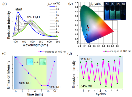 图2. (a) 在DMF中随着水的体积变化荧光发射光谱的变化;(b) 在不同比例DMF/H2O混合溶剂下CIE色度图;(c) 制成薄膜后在不同湿度下最大发射峰的强度变化比较;(d) 在高湿度和低湿度环境中薄膜发光的循环性。