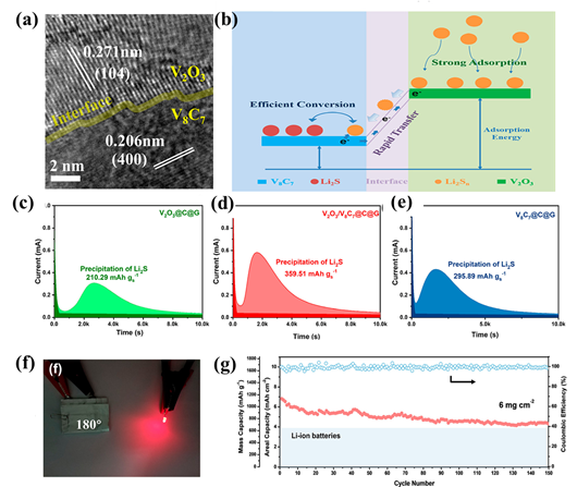 图1:(a) V2O3/V8C7异质结的高倍透射电镜图;(b) V2O3/V8C7异质结构抑制穿梭效应机制的示意图; (c)- (e) Li2S在不同反应表面上的沉积;(f) 折叠180o时的软包电池;(g)软包电池在0.2 C下的循环性能