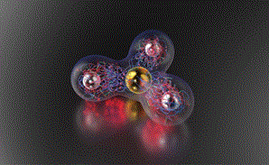 图2. 聚合物修饰的纳米粒子定向键合形成纳米尺度胶体分子。(A)典型的硼(B)和氟(F)原子结构以及BF3的分子结构。(B-F)纳米粒子反应形成BF3型胶体分子的过程图示(B);不同反应时间下,产物的扫描电子显微镜照片(C); 胶体分子产率统计分布随反应时间变化(D); 不同反应时间,所得 胶体分子内键角的统计分布(E);计算机模拟胶体分子的成键过程(F)。