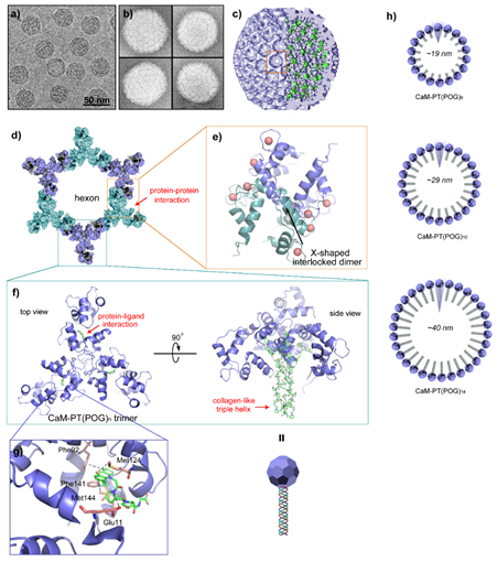 研究发现蛋白笼的纳米尺寸依赖于分子配体长度(图2)。随着寡肽链聚合度(n)的增加,蛋白笼的尺寸也相应扩大,分别达到19.2 nm (n = 6) ,29.4 nm (n = 10) 和40.5 nm (n = 14);同一配体形成的蛋白笼具有几何一致性。这些结果表明仅通过定制配体化学即可精确调控蛋白笼的组装结构,相比于传统策略中对蛋白本身的界面修饰或工程化,大大提高了人为改造蛋白笼结构与功能复杂性的可能。冷冻电镜和三维解析提供了蛋白笼的分子层次结构:蛋白笼具有二十面体对称性,外壳由CaM组成,内层由刚性配体PT(POG)n支撑(图3a-c),类似病毒衣壳;蛋白笼表层由正六边形周期性排列的蛋白六邻体(hexon)组装形成,每个六邻体单元又由CaM三聚产生(图3d),相邻两个单元依托CaM变构后的蛋白-蛋白相互作用形成具有确定二面角的X形互锁二聚体(图3e);而CaM三聚体则是通过配体三重螺旋化和配体-蛋白相互作用构成的三脚架形蛋白结构(图3f-g)。这三种超分子力相互协同导致蛋白笼的精确组装,其中配体分子的长度与刚性决定了笼体的几何尺寸(图3h)。相应调节Ca2+浓度控制CaM构象状态可快速解离或重组蛋白笼结构,实现内部DNA功能客体的释放。