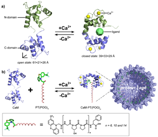 图1. (a) 钙调蛋白CaM在变构因子Ca2+调节下的变构现象;(b) 变构效应驱动的蛋白笼精确组装。