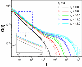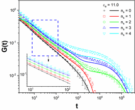 图3 链段松弛函数g2(t)的模拟(散点)与SRM理论预测(实线)比较。 (a)表示不同粘性链段数目,(b)表示不同缔合强度。