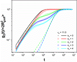 除了宏观层面上的力学松弛行为,我们进一步比较了分子层面上的弛豫过程,即缔合高分子链的构象松弛,并提出了表观质心的概念,以及每个链段相对于表观质心的扩散函数g2(t)。同样,不借助任何拟合参数,直接通过理论计算得到了与模拟定量一致的结果,如3所示。在进一步分析结构缺陷对力学松弛与链段松弛函数的影响时,我们发现引入构象平均并不能显著提高SRM对G(t)的理论预测精度,但对于g2(t)却有十分显著的效应。因此基于SRM可以十分准确地描述出单链的构象松弛过程。