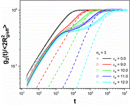 为了进一步验证SRM所预测的理论结果,我们开展了分子动力学模拟研究。通过模拟不仅能方便地表征缔合体系中的微观动力学,同时可进一步分析在理论计算中忽略的其他因素。首先考察了模拟体系在不同缔合参数条件下的动力学行为,通过考察缔合弛豫时间τsti随缔合强度与反应物浓度的变化关系,确定了在模拟体系中发生的是活化能固定的二元跃迁反应,因此提高粘性链段浓度会加快缔合反应的速率。此外,这一缔合反应并不会受到体系凝胶化过程的影响,因此是一个完全由反应动力学决定的过程。