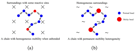 目前在不考虑稀溶液条件下的流体力学效应以及高分子缠结效应时,可以通过拓展经典Rouse模型理解缔合高分子的线性粘弹性。基于高分子体系中应力的分子表达形式,我们指出,从分子层面理解缔合高分子体系流变学行为的关键在于如何描述一条缔合高分子单链处于其它高分子链背景下的布朗运动。为此我们提出了粘性Rouse模型(Sticky Rouse Model, SRM),其物理图景如图1(b)所示,即考察具有不同运动能力的链段在一个均质背景中的运动。运动能力的差异用一个表观摩擦系数参数δ表示,直接由缔合强度决定。