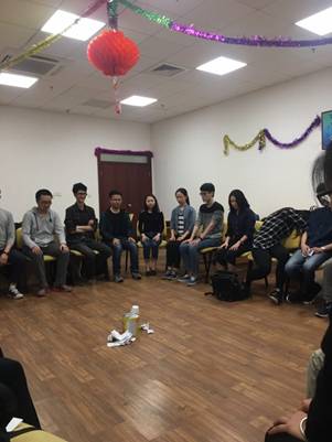 活动的由一个团体小游戏开始。团训员和辅导员及同学们围坐在一起进行句子接龙的游戏,在游戏的带动下,同学们都十分轻松和高兴,为之后心理团训的开展打下了良好的基础。