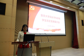 在庄严的国歌声中,大会正式开始。系党委副书记、学生党总支书记王芳代表上届学生总支委员会作《坚守立德树人初心,培育国家栋梁之才》的工作报告。报告主要从过去的主要工作回顾和新时代的发展目标与任务两大方面展开。系第一届学生党总支委员自成立以来,在学校、系党委的正确领导和支持下,坚守立德树人初心,牢记为党育人、为国育才使命,在基层党建、学生思想政治教育等方面取得了显著的成绩。在新时代要求下,学生党总支要提高工作站位,进一步加强政治核心作用;发挥示范引领,进一步推进党建工作标准化规范化建设;扎根学科特点,大力提升学生思政工作精准性和实效性,要传承复旦人、高分子人的红色基因,为把复旦大学高分子学科建成国内顶尖、国际一流的高水平学科,为实现高分子强国梦想而努力奋斗!