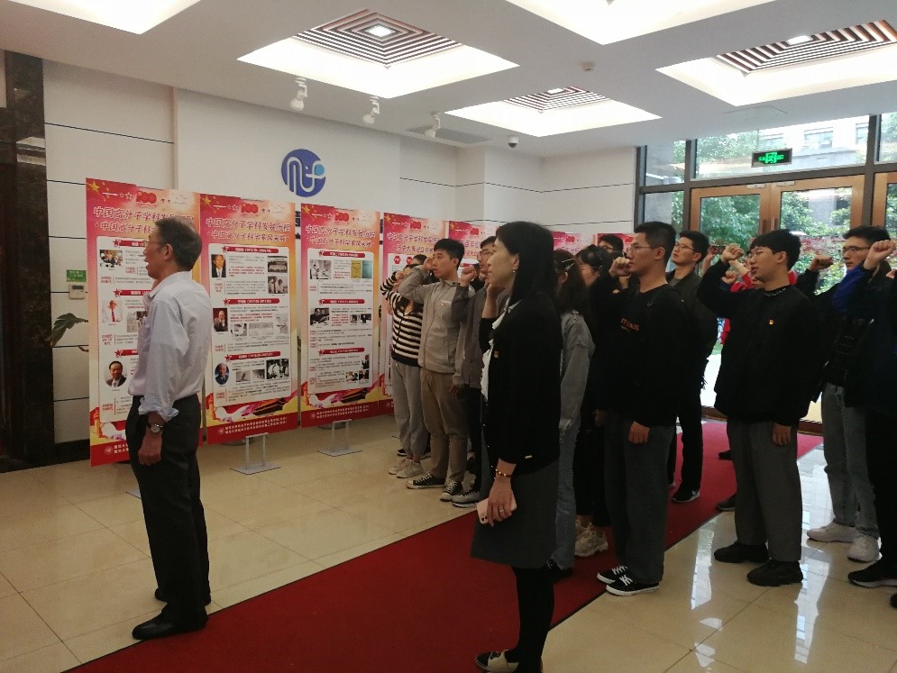 在四位同学的精彩分享后,支部书记陈舒雯结合科学家们的科研报国经历,带大家重温了习近平总书记在去年6月给复旦大学《共产党宣言》展示馆的回信,信中里提到“心有所信,方能行远”。为了致敬老一辈科学家的报国初心,坚定心中所信,由张炜老师领誓,带领支部成员们面向党旗重温了入党誓词。