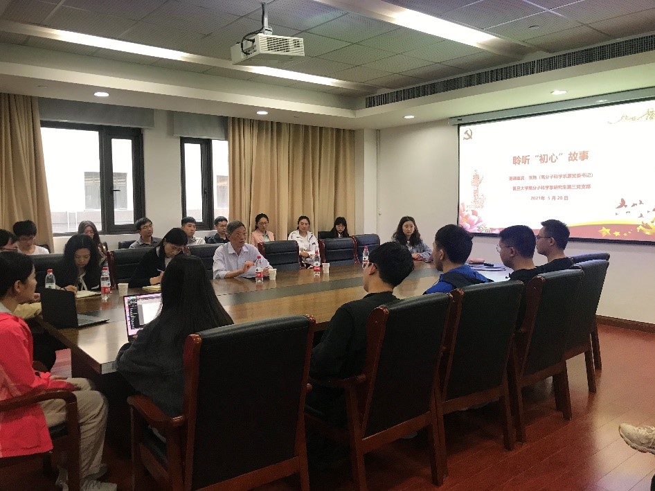 随后,支部特邀张炜老师结合亲身经历讲述了Bet365中文网址 的老一辈科学家、共产党人在学科创建与发展过程中的“初心”故事。在复旦高分子学科建设初期,当时作为教学科研场所的跃进楼基础设施十分简陋,实验条件也捉襟见肘。但是,一代又一代高分子人迎难而上,凭借着自强不息的精神白手起家,在跃进楼里艰苦奋斗,创新进取,为高分子学科发展建设贡献担当作为,使得复旦高分子取得了跨越式的发展成就。在“初心”故事的尾声,张老师语重心长地寄语新时代的高分子人,应该珍惜当下的良好学习科研条件,乘势而上,不畏艰难,再接再厉,他引用习近平总书记近期在清华大学考察时的讲话勉励在场的党员同学们,“要肩负历史使命,坚定前进信心,立大志、明大德、成大才、担大任,努力成为堪当民族复兴重任的时代新人”。随后,党员同学积极地与张老师进行了互动交流,就“高分子人的传统与坚守”“个人发展与国家需求的结合”等话题展开了热烈深入的讨论。通过聆听“初心”故事,党员同学们纷纷感受到学科发展成就的来之不易,更表示将勇挑重担,接续奋斗。