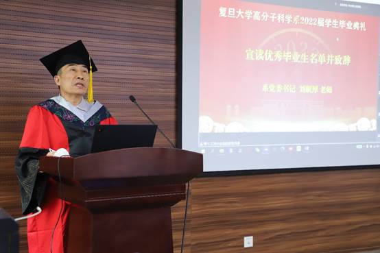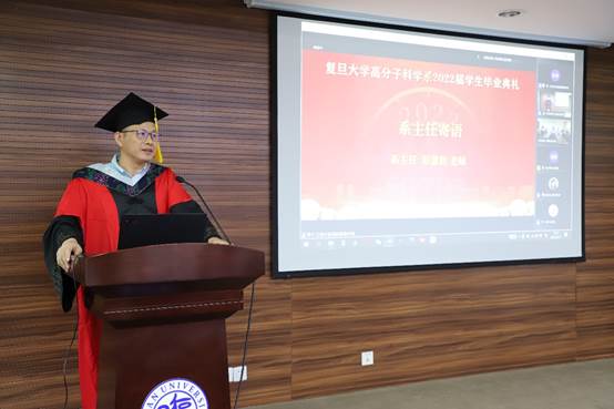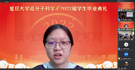 副系主任杨武利老师、冯嘉春老师宣读了2022届毕业生名单。路晨昊、时家悦、臧雨茗分别作为博士、硕士和本科毕业生代表分别发言。路晨昊刚刚荣获复旦大学第十三届研究生“学术之星”特等奖,他分享了在校学习与科研的努力与收获,并表示会始终铭记“要做顶尖的科研”的教诲,继续砥砺前行,在高分子领域开创新的未来。时家悦感谢导师的教导和学生工作给她带来的成长,希望能够将个人理想融入国家和民族的事业中,带着初心和梦想勇往直前。臧雨茗回顾了在高分子系的成长和蜕变。高分子系就像是一个条件适宜的反应釜,能够给予学生充分反应的良好环境,让同学们实现了从孤立分散、懵懂无知到凝心聚力、奔赴山海的聚变。