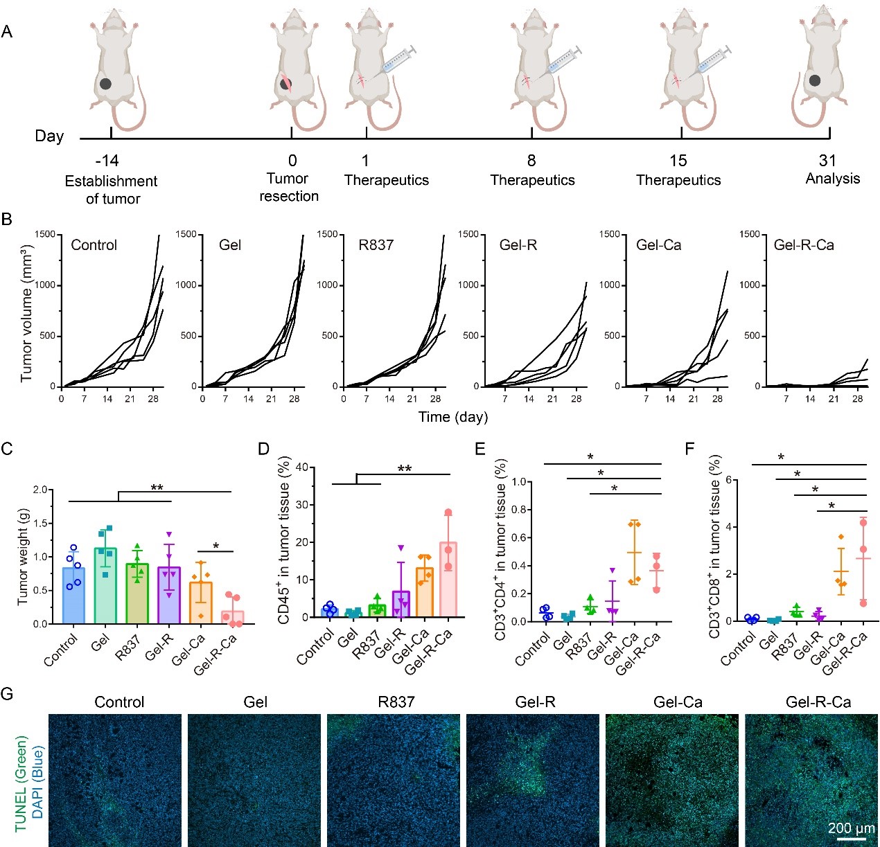 丁建东团队还通过建立小鼠术后切除肿瘤模型考察了新制剂的有效性,部分结果如图4所示: