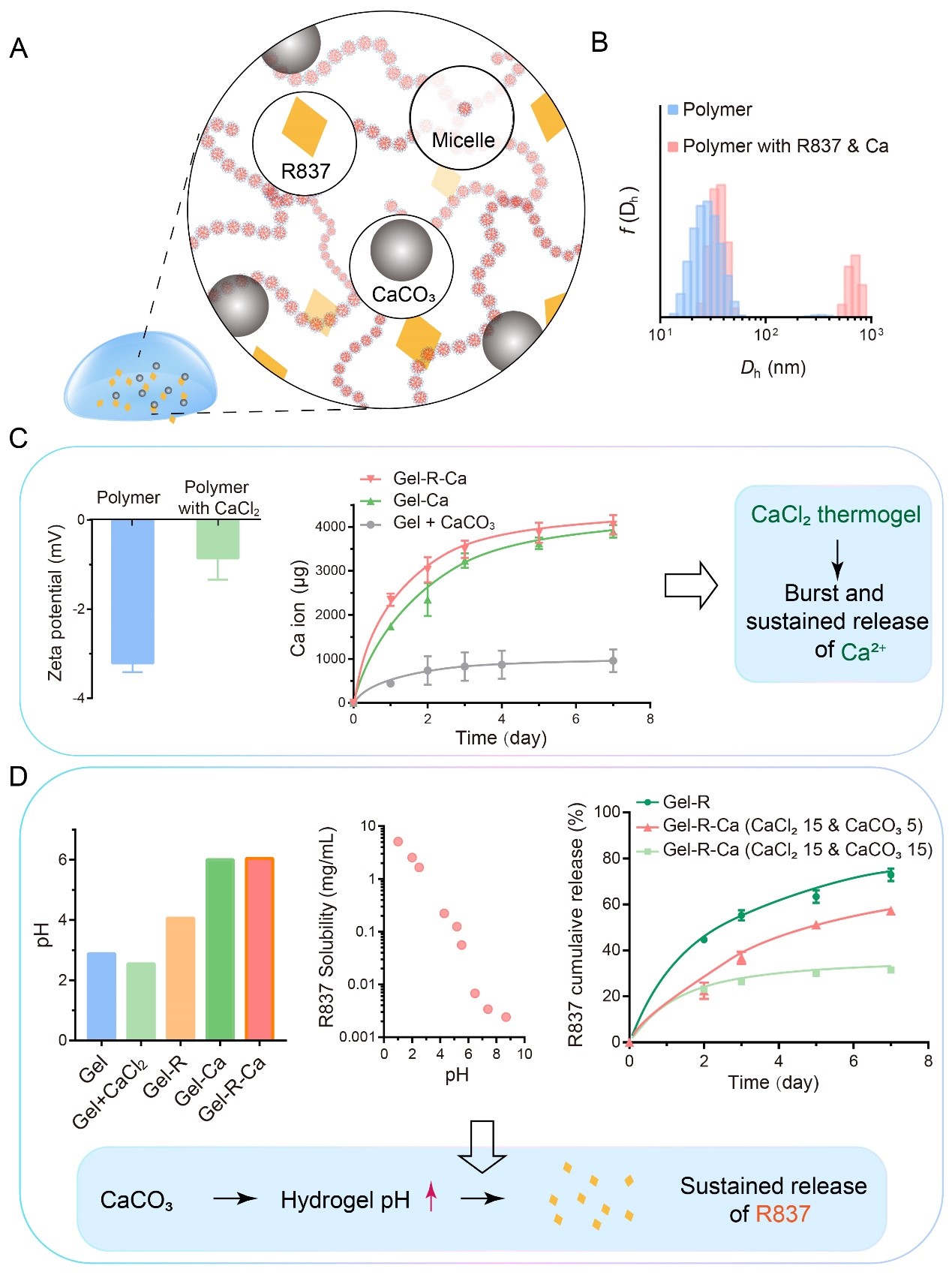 所发明的制剂通过共混一定比例钙盐和免疫佐剂R837制备治疗/预防一体化肿瘤疫苗(图3)。钙死亡是指在细胞内钙浓度异常性升高从而导致的细胞死亡。研究表明,肿瘤细胞钙死亡可以导致免疫原性死亡,从而从肿瘤“内部”提供肿瘤抗原。氯化钙以离子状态分布在凝胶中,在注射后原位产生大量钙离子,从而使残留的肿瘤细胞产生钙死亡。碳酸钙和R837均以微晶的形式包裹于凝胶中,可以实现高载药量和包封率。经调节,该制剂具备合理的释放曲线。