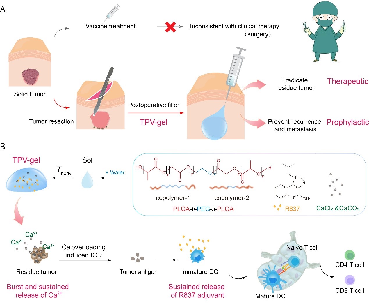 技术基于其课题组长达二十年在热致水凝胶领域的积累和面向临床需求开展基础研究的思考。所发明的TPV凝胶可以原位注射到肿瘤切除后的手术腔内,通过“钙死亡”机理清除残留肿瘤细胞,达到治疗目的;另外,肿瘤细胞产生的内部抗原结合佐剂的长效缓释,可以激活机体对肿瘤的特异性免疫,从而发挥抗术后复发和转移的效果。