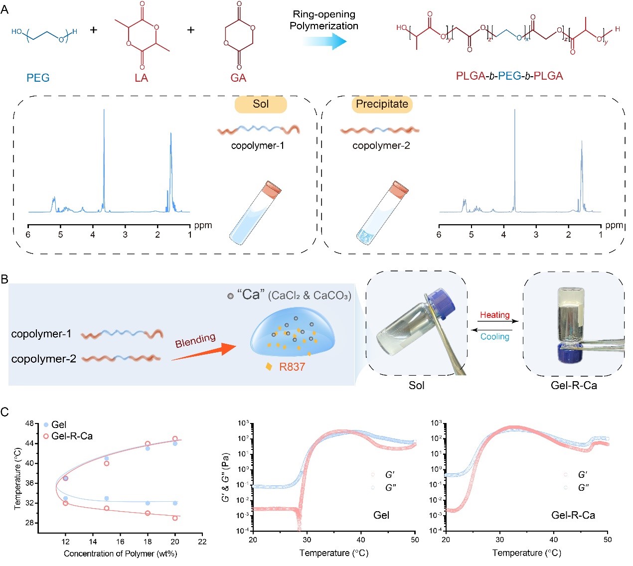 TPV凝胶采用基于聚酯-聚醚嵌段共聚物作为可注射水凝胶的基材,通过丁建东团队提出的“block blends”策略赋予体系独特的“低温溶液,体温凝胶”特性(图2)。这种 “block blends”将单独可溶于水的嵌段共聚物-1(copolymer-1)和不溶于水的嵌段共聚物-2(copolymer-2)共混后产生物理凝胶化的窗口。该可注射水凝胶制剂特别适合用于术后注射。而针对乳腺癌等术后患者,凝胶的填充尤有意义。