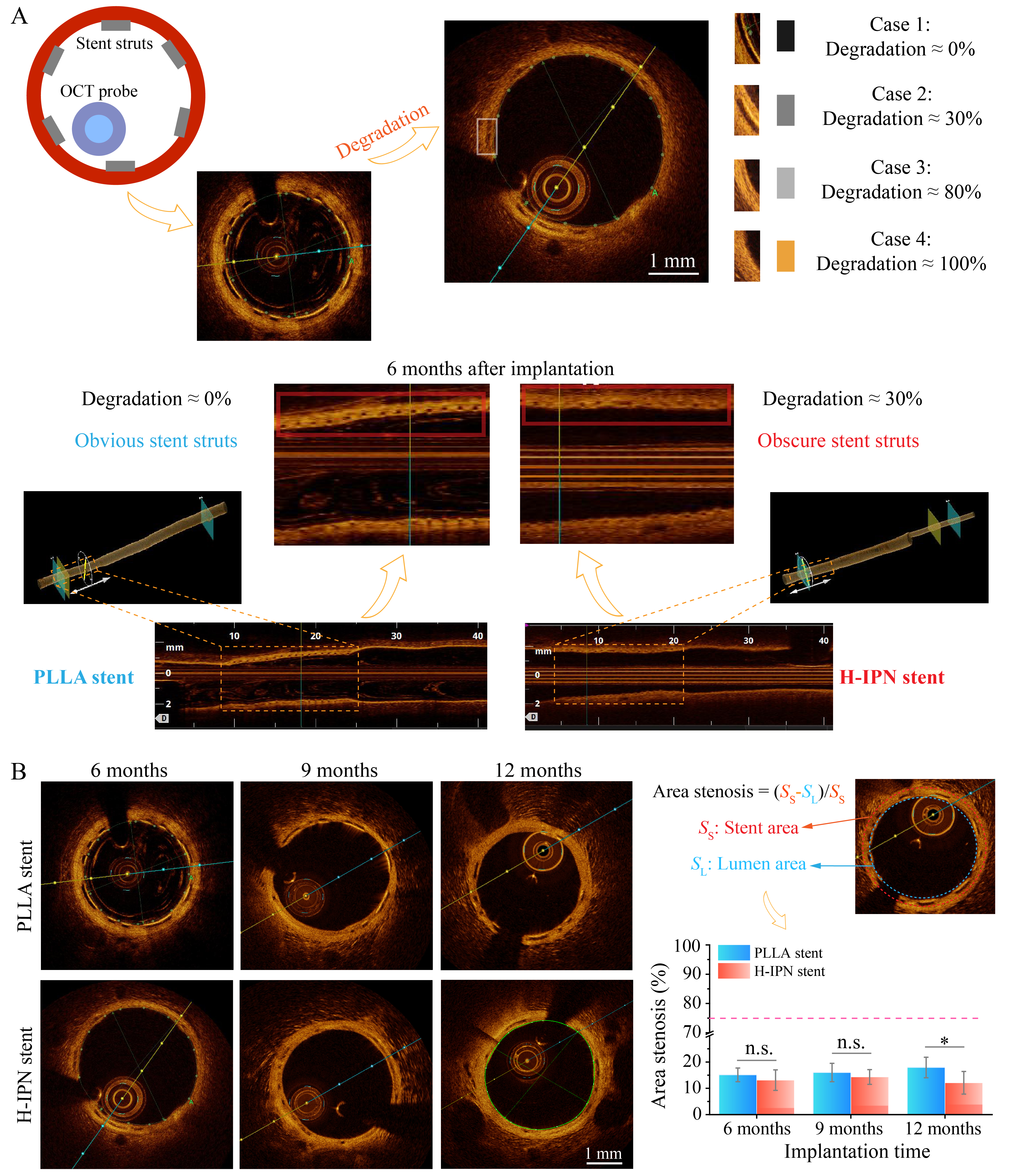 The feasibility and safety of the H-IPN stent for interventional therapy have been validated by animal experiments, and some results are shown in Fig. 5. During the follow-up of 12 months, all the stented arteries kept well unobstructed, and the lumen diameters matched well with the original artery diameters. Vascular endothelialization was completed at about 3 months after implantation of the coronary stent, and no thrombosis occurred. The intravascular ultrasound (IVUS) and optical coherence tomography (OCT) images indicate that very obscure struts of the H-IPN stent were observed at 9 months after implantation, while the struts of the PLLA stent were clearly observed, which demonstrated that the H-IPN stent degraded significantly faster than the PLLA stent. The restenosis rate of the H-IPN stent is well below the acceptable criterion throughout the follow-ups.