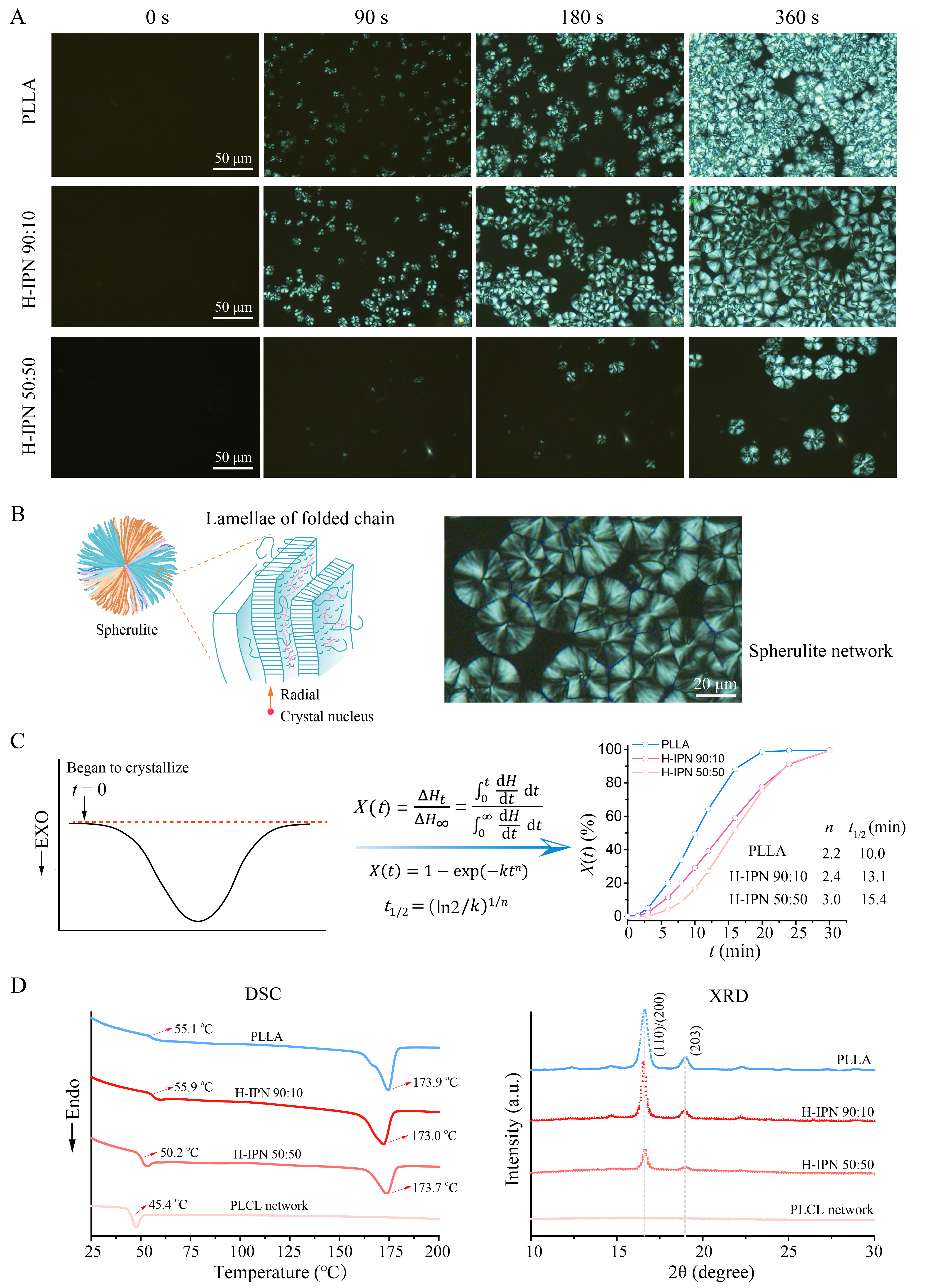 The H-IPN material includes a physical network of spherulites and a chemical crosslinking network, and the chemically crosslinking network in the H-IPN may be distributed in the amorphous region of spherulites, and permeated into the spherulite network. The formation process of the H-IPN material depends on a designed sequence of time and temperature. The formation of the chemically crosslinked networks requires the temperature below the melting temperature Tm of linear PLLA, but above its crystallization temperature Tc. Then, no crystallization occurs at the initial stage, and chain segments of polymers have strong mobility, easy to realize sufficient crosslinking. The photoinitiating was triggered by UV light, and the photoinitiated free radical polymerization and hydrogen abstraction reaction jointly led to the formation of an interpenetrated network between PLCL and PLLA chains (Fig. 2).