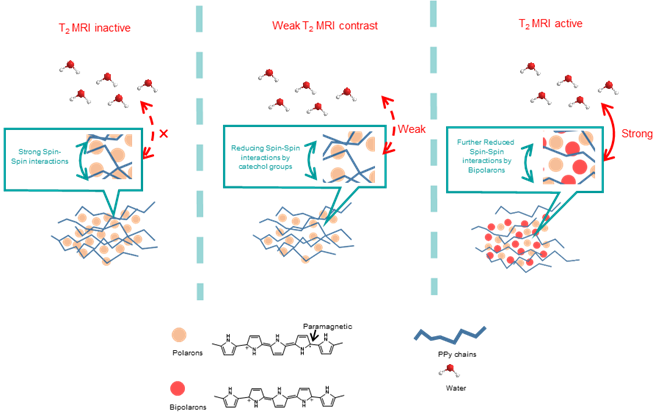 The oxidized forms of conjugated polymers are paramagnetic polarons (cation) and diamagnetic bipolarons (dication). The strong “spin-spin” interactions between polarons hinder the interactions between polarons and water protons. Thus, polarons cannot interact with water protons to generate MRI contrasts. Based on above speculations, Shao’s group develops a “partially complexed” method using catechol derivatives to release polarons from the strong “spin-spin” interactions. Meanwhile, the population of bipolarons is elevated. Biopolarons can enhance the interactions between polarons and water protons by electrostatistic repulsion interactions. As-prepared polypyrrole nanoparticles can be used for in vivo magnetic resonance imaging. Besides, this “partially complexed” method works for preparing T2-MRI active agents based polypyrrole, polyaniline and polythiophene derivatives.