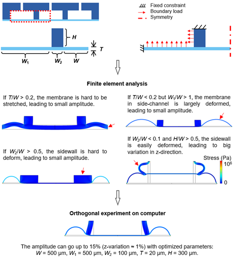 Figure 2. Optimization of chip structure by finite element analysis and orthogonal experimental design. In order to facilitate the calculation of the physical model, the chip structure was refined to obtain simple geometric structures and boundary conditions, and then the deformation of the chip under the action of air pressure was studied by finite element analysis. Finally, the optimal structure was obtained on computer through orthogonal experimental design. The color scale of the simulation outputs represents the distribution of stress. W1: width of activation cavity, W2: width of sidewall, T: thickness of membrane, H: height of microchannel.