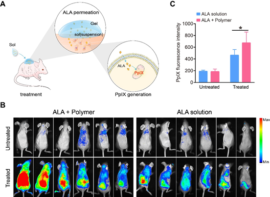 Figure 3. In vivo experiment to demonstrate the efficacy of the transdermal delivery of the ALA loaded hydrogel formulation.