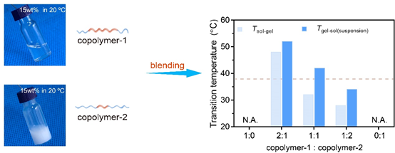 Then the facile adjustment of the two state transition temperatures gets to be the key to the corresponding biomaterial, since the traditional adjustment method of changing molecular wight of polymers is expensive and complicated. To this end, Ding’s group employed the “block blend” strategy put forward previously by their own group, in which two PEG/PLGA block copolymers were mixed to generate a thermogel system with highly tunable transition temperatures. One of the amphiphilic copolymers was relatively hydrophilic (copolymer-1), the other was relatively hydrophobic (copolymer-2). Each of them cannot exhibit sol-gel-precipitate transitions in water with temperature changing, but the appropriate blends can, and the transition temperatures could be well tuned, as shown in Figure 2.