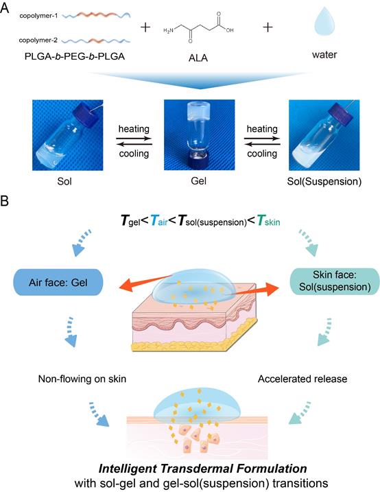 Ding’s group at Fudan University reports, for the first time, a case employing both the sol-gel transition and the gel-sol(suspension) transition, which was found in their development of a transdermal hydrogel formulation. The transition temperatures of the formulation can be adjusted to meet the condition of sol-gel transition temperature (Tgel) < room temperature (Tair) < gel-sol(suspension) temperature (Tsol(suspension)) < body temperature (Tbody). Therefore, after applying to a skin, formulation of spontaneous asymmetry with a hydrogel outside and a sol(suspension) inside could avoid free flowing and achieve rapid release to ensure an efficient photodynamic therapy (PDT).