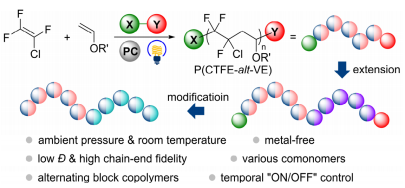 While the development of reversible-deactivation radical polymerization (RDRP) has been demonstrated to be particularly effective for acrylates and styrene. the transformation of fluoroethylene (i.e., chlorotrifluoroethylene (CTFE) through a controlled pathway remains a significant challenge. Considerable research efforts have been devoted to synthesize copolymers of CTFE, however, owing to its low boiling point(-26.2 ℃), the synthetic routes typically require high pressure at elevated temperatures (80 to 250 ℃), which limits the broad study of related products. Recently, PolyMao group developed photocatalyzed reversible-deactivation copolymerization to realize precise synthesis of main-chain alternating fluorinated copolymers under ambient conditions, promoting the synthesis of